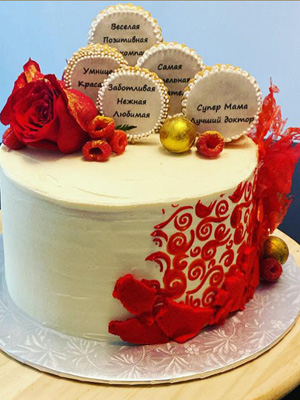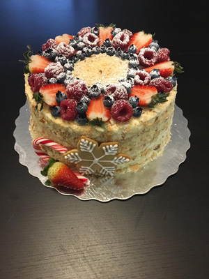 Sponge cake with mascarpone cream, confit and fresh berries inside. Custom made outside.